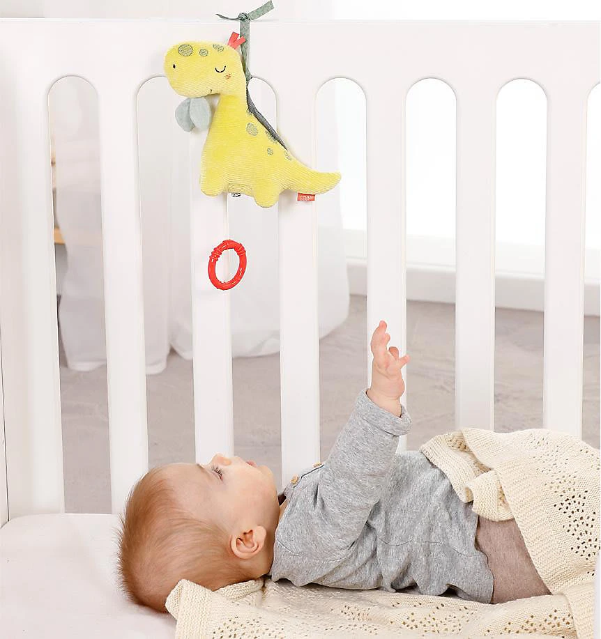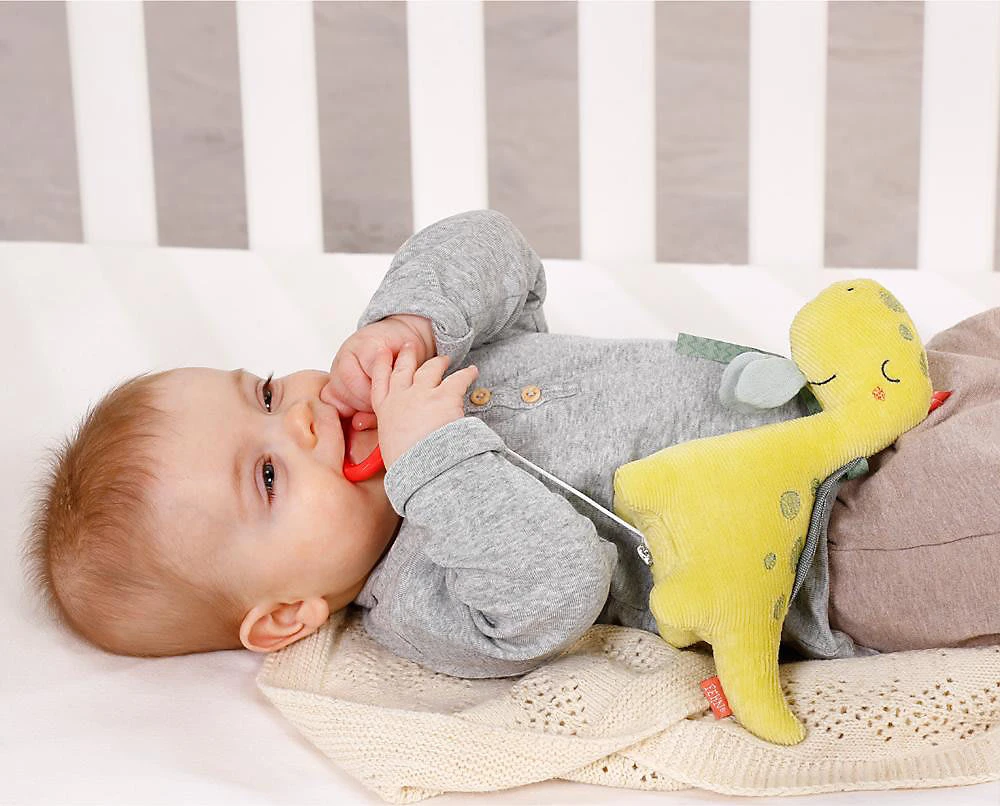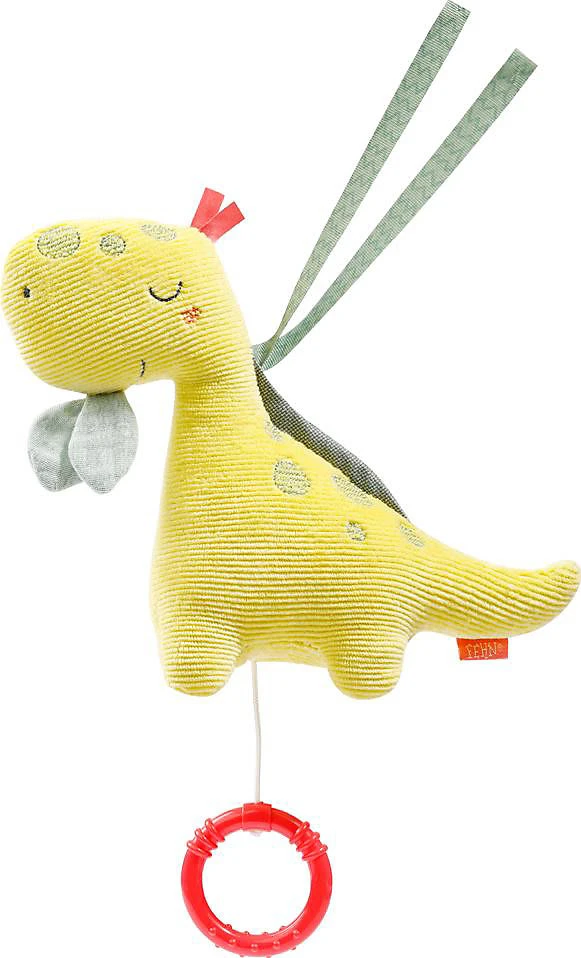 Die Fehn Mini Spieluhr Dino fungiert als Kuschelobjekt und natürlich als entspannende Einschlafhilfe. Die Aufzieh-Spieluhr mit der Melodie “Mozarts Wiegenlied” beruhigt in jeder Situation – perfekt für Babybett, Kinderwagen, Babyschale.