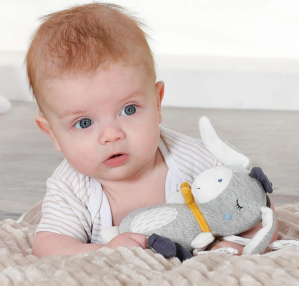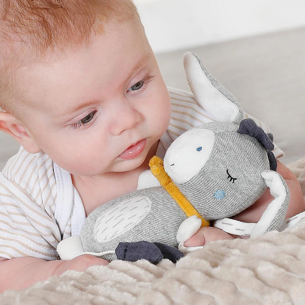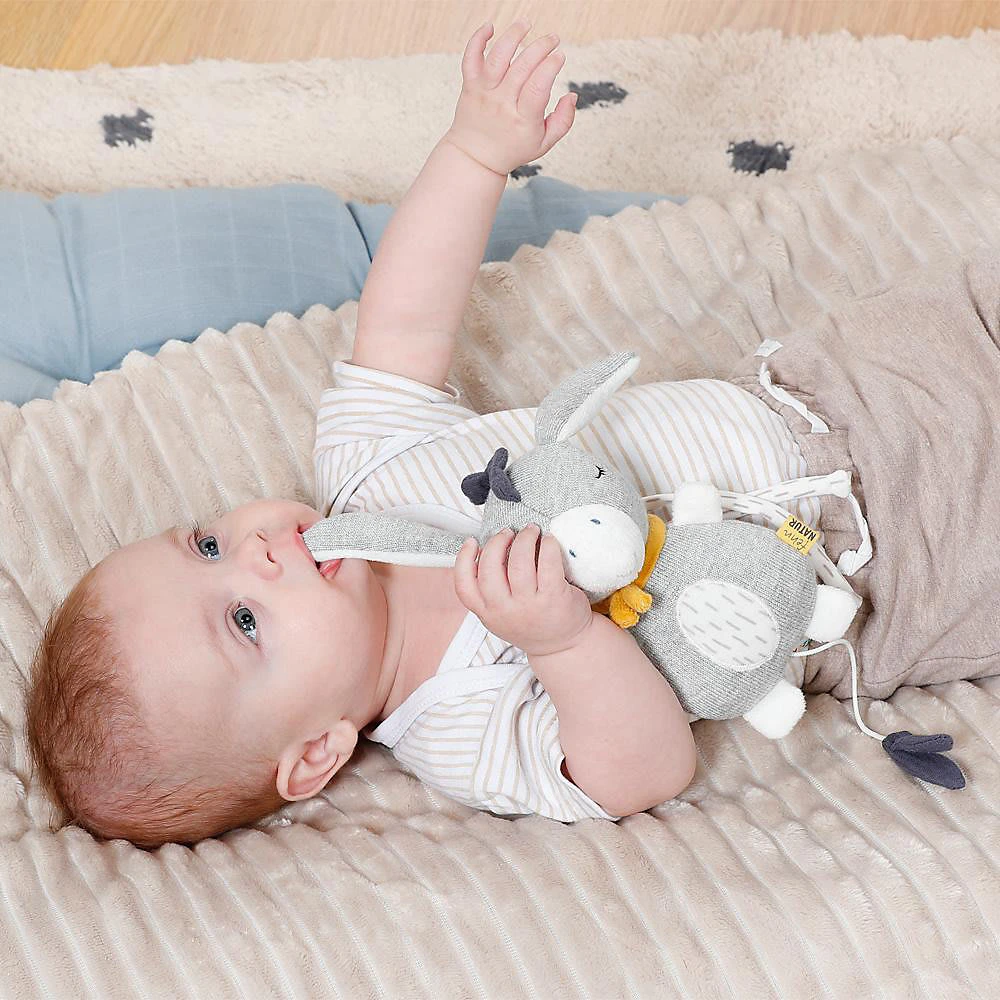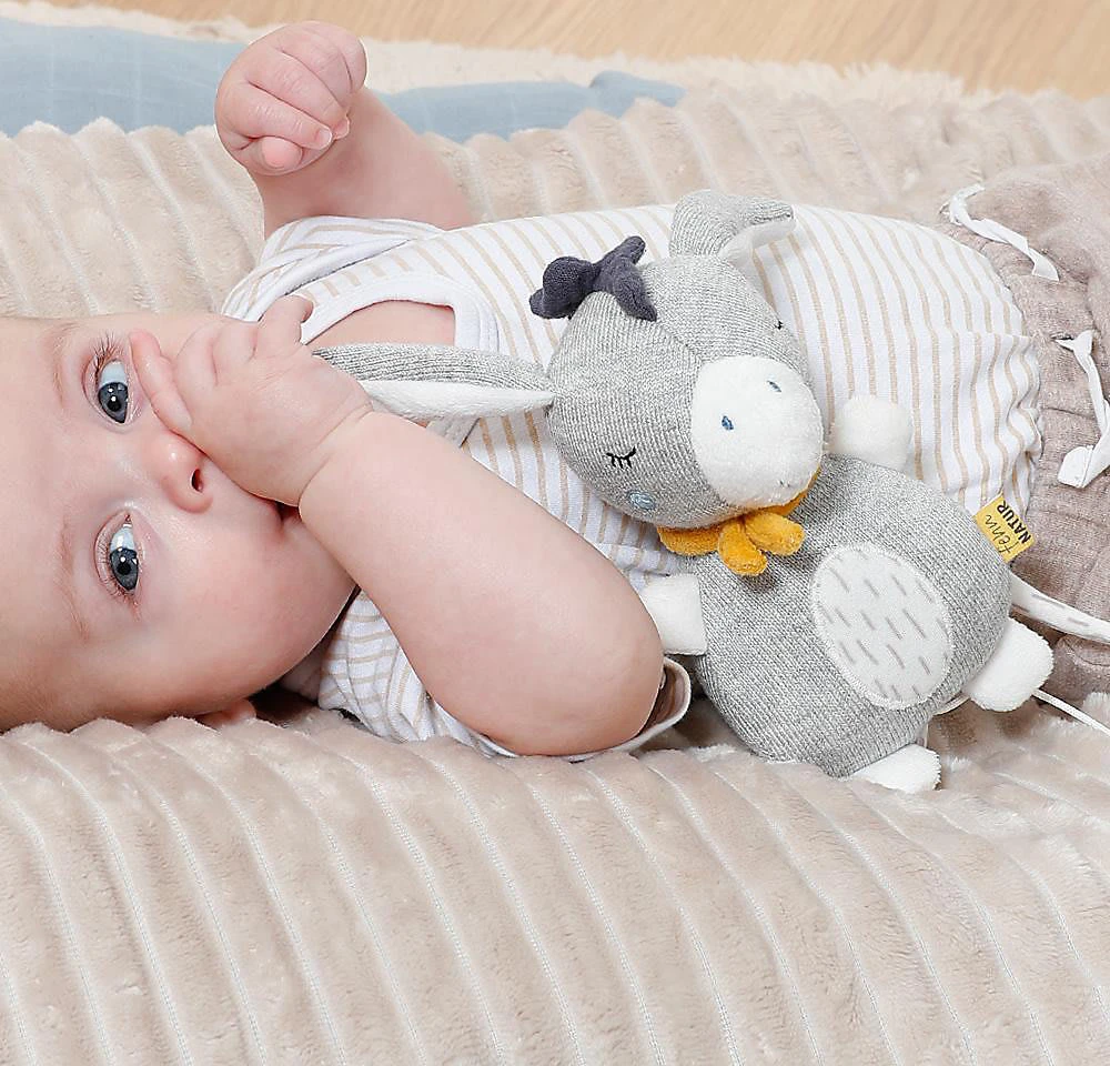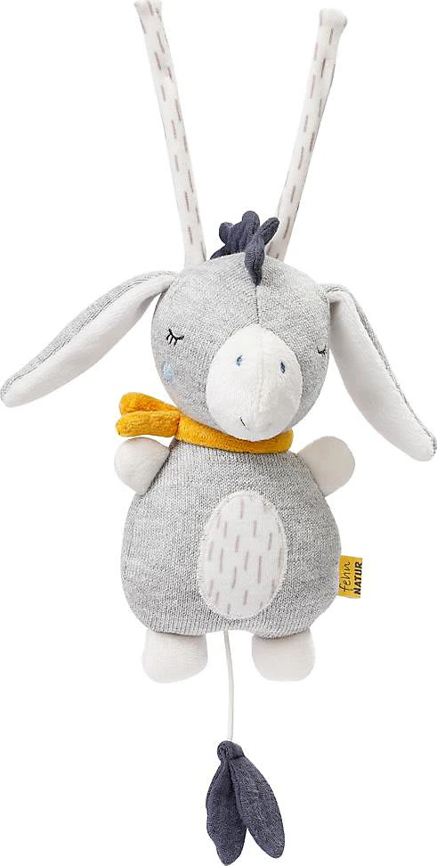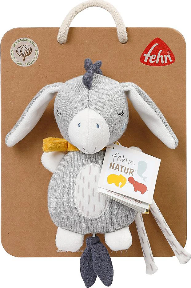 Die Fehn Mini Spieluhr Esel aus der fehnNATUR-Serie fungiert als Kuschelobjekt und natürlich als entspannende Einschlafhilfe. Die Aufzieh-Spieluhr mit der Melodie “Brahms Wiegenlied” beruhigt in jeder Situation – perfekt für Babybett, Kinderwagen, Babyschale. Die weiche Füllung besteht aus reiner Bio-Baumwolle (aus kontrolliert biologischem Anbau).