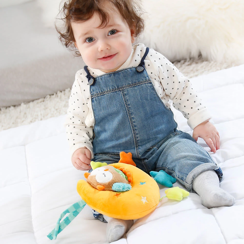 Die entzückende Eule im Mond wird mit zwei Bändern ganz einfach an Bettchen, Kinderwagen oder Babyschale befestigt.