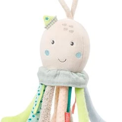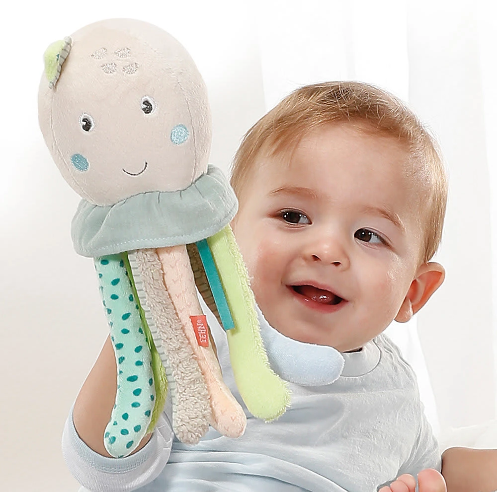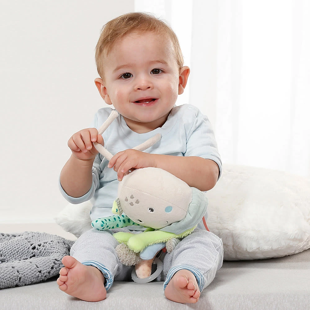 Die lustige Spieluhr “Oktopus” von Fehn ist ein zuverlässiger Begleiter für Kinder, der sie stets beruhigt und dabei hilft, entspannt einzuschlafen. Der süße Oktopus mit Hut und bunten Tentakeln bietet Kindern jede Menge Greif- und Spielmöglichkeiten. Wird an dem herunterhängenden Ring gezogen, spielt die Spieluhr ungefähr zwei Minuten lang die Melodie “Guten Abend, gut Nacht” (Brahms Wiegenlied). Davon werden Kinder besonders entspannt in den Schlaf gewiegt! Dank der praktischen Befestigungsbänder lässt die Spieluhr sich kinderleicht am Bettchen, am Kinderwagen und anderen Orten befestigen.