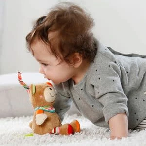 Der niedliche Teddy aus der Classic Stars Kollektion von Fehn ist nicht nur ein treuer Begleiter, sondern tröstet und beruhigt mit seiner sanften Einschlafmelodie „Weißt du wieviel Sternlein stehen“. Mini-Spieluhr Teddy von Fehn mit integriertem und herausnehmbarem Spielwerk Melodie: “Weißt du wieviel Sternlein stehen” ab Geburt Größe: 18 cm Erobert Babyherzen im Nu: Der kuschelweiche Teddy mit seinem freundlichen Gesicht lässt sich knuddeln und liebhaben & die sanfte Melodie „Weißt du wieviel Sternlein stehen“ tröstet und beruhigt in jeder Situation. Die Spieluhr wird mit den zwei Bändern am Bettchen, Kinderwagen oder an der Babyschale befestigt und lässt sich so ganz einfach mitnehmen – ein treuer Begleiter ob zuhause oder unterwegs. Das Plüschtier ist ohne Spielwerk bei 30°C waschbar – dafür kann das Spielwerk durch Öffnen des Sicherheitsverschlusses entnommen & nach dem Waschgang wieder eingesetzt werden.