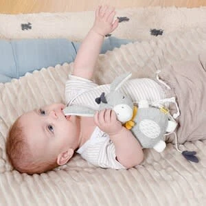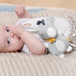 Die als Esel designte Mini-Spieluhr aus dem fehnNATUR-Sortiment von Fehn überzeugt als Einschlafhilfe und Kuscheltier. Sie ist 19 Zentimeter groß und aus weichen Textilien gefertigt. Spieluhr von Fehn herausnehmbares Spielwerk zum Aufziehen Melodie: Guten Abend, gut´ Nacht (Brahms Wiegenlied) aus Strick, Nicki, Jersey und Musselin aus Bio-Baumwolle ab Geburt geeignet Strick, Jersey, Musselin und Nicki aus Bio-Baumwolle verleihen dem kleinen Stoff-Esel eine angenehme Haptik. In dem niedlichen Tier steckt eine klassische Aufzieh-Spieluhr, die mit Brahms Wiegenlied den Nachwuchs in den Schlummer begleitet. Die sanfte Melodie beruhigt das Kind und hilft beim Einschlafen. Soll der Esel gewaschen werden, kann das Spielwerk herausgenommen werden.