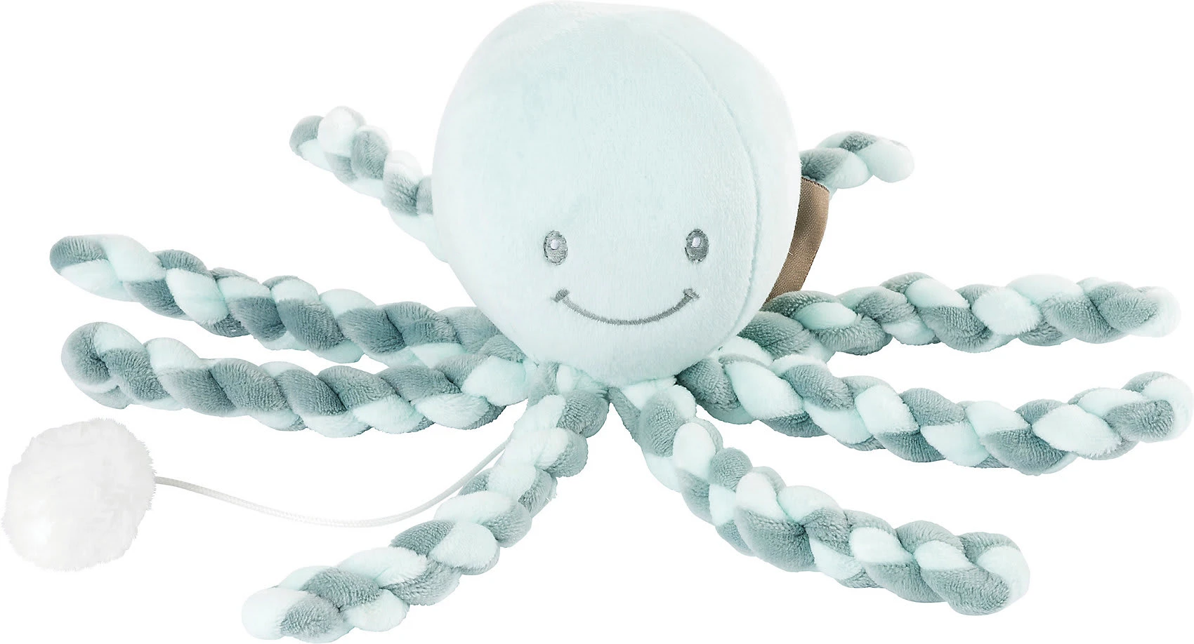 Die Spieluhr in Form einer niedlichen Baby-Krake verzaubert mit der beruhigenden Melodie „La-Le-Lu“, die beim Ziehen an der Schnur abgespielt wird. Weiches Nicki-Material lädt zum Kuscheln und Spielen ein. Für süße Träume!