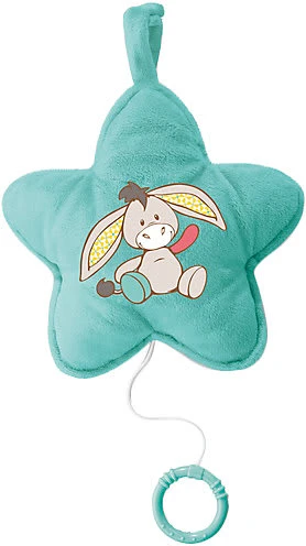Die plüschig-weiche Spieluhr in Sternform mit süßen Esel Muli-Print von myFirstNici, schenkt kleinen neuen Erdenbürgern Geborgenheit und begleitet sie sanft ins Land der Träume. Wird an der Schnur gezogen, so ertönt das wunderbar beruhigende Wiegenlied von Schubert.