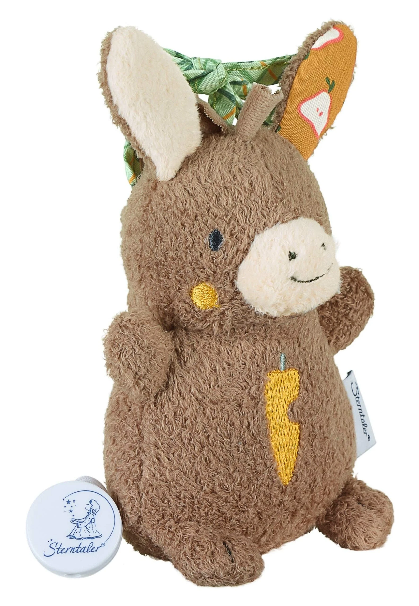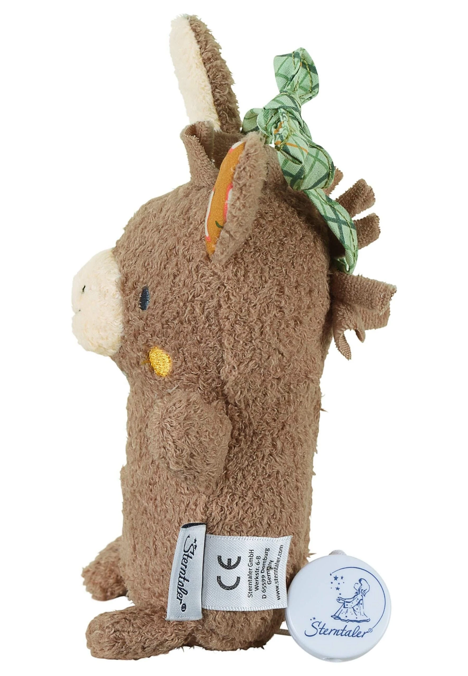 Der süße kleine Esel Emmilius aus Flauschstoff und Polycotton mit Spieluhr singt das Baby in den Schlaf. Bindebänder sorgen für eine einfache Befestigung an Bettchen, Kinderwagen oder im Auto. Melodie: The Sound of Silence